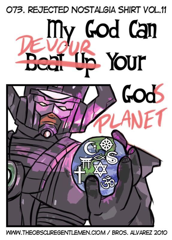 After seeing the pathetic turnout of religious zealots picketing Comic-Con for "having false gods," it made me want to make a nostalgic shirt on the matter. I felt Galactus the devourer of worlds was a good representative of the anti-Comic Con people with funny picket signs saying things like "Darkseid Is," amongst other things. So, I love the image of Galactus looming over an earth that was (to some) created by some deities. In response to deities, make mine Marvel.