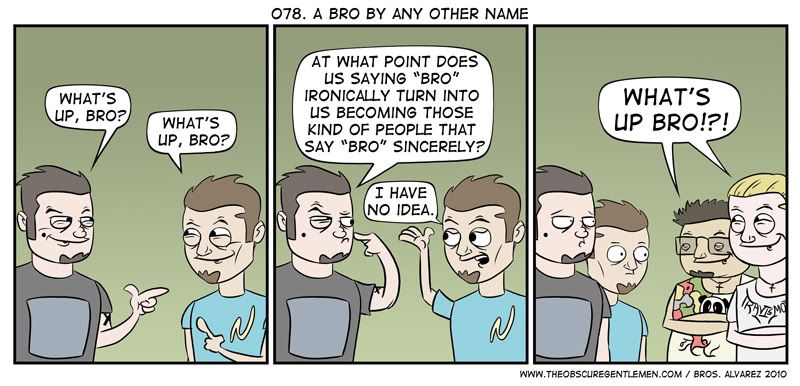 Since meat-heads and bros say "bro," me my friends and I have ironically used the term to greet each other. After awhile, though, I realized the term was being used all too much. I went from loving our ironic mockery to thinking holy shit, people listening to me greet my friends most likely think I'm being sincere. I wonder when people realize that their ironic use of anything no longer is ironic.