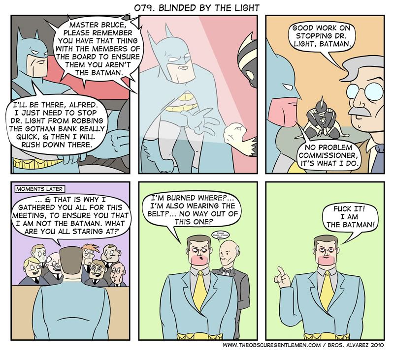 I was talking to my friend Joey of Noctuary and End Happy fame, and he had an idea for a comic strip involving superheroes getting tans from their costumes. I also thought about how superheroes deny and trick people into thinking they aren't heros. I would rather have them just admit it and be done with it. Secret identities, to me, are pretty silly and aren't realistic, but that's why I don't read DC comics anymore.