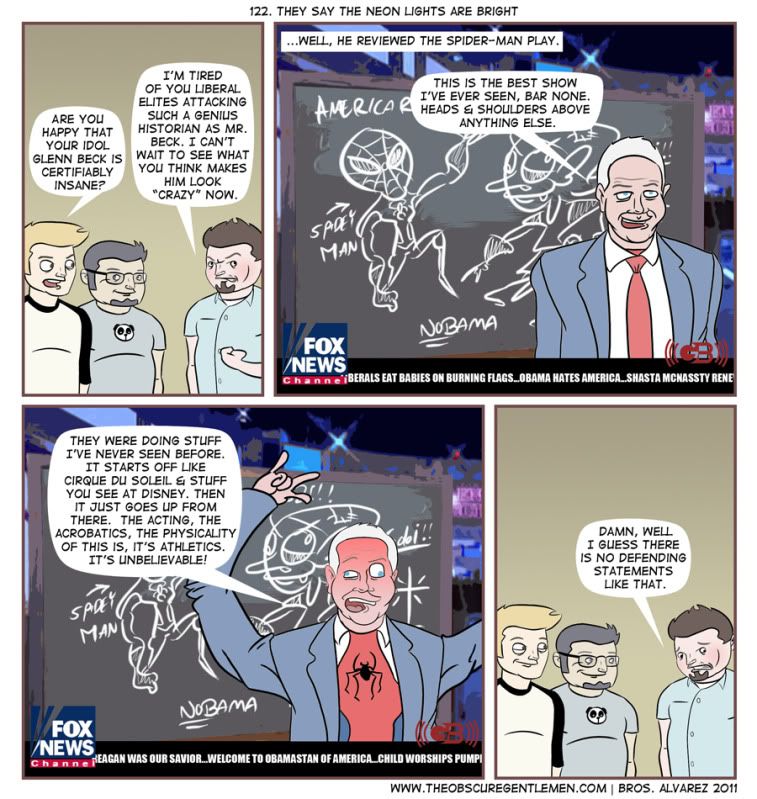 I then heard that Glen Beck went on and on about how loved the musical and thought this shows just how insane he is. To verify, I found the video on YouTube where he goes on about the brilliance of this postponed and troubled musical, even when the Green Goblin's design for the play makes Willem Dafoe's outfit look stylish.